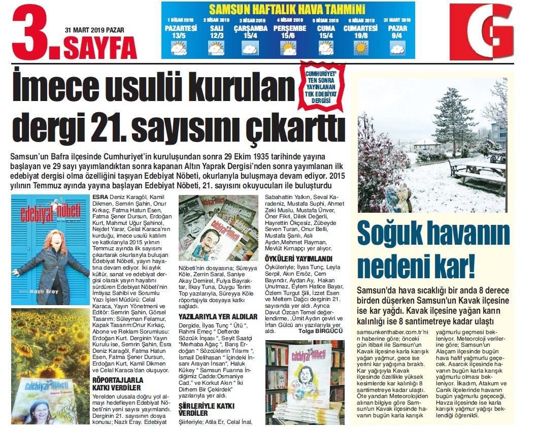 Dergide, İlyas Tunç “ Ütü “, Rahmi Emeç “ Defterde Sözcük İnşası “, Seyit Saatçi “Merhaba Ağaç “, Barış Erdoğan “ Sözcüklerin Tılsımı “, İsmail Delihasan “ İçindeki İnsanı Arayan İnsan“, Haluk Kükey “ Samsun Fuarına İndiğimiz Cadde:Osmaniye Cad.” ve Korkut Akın “ İki Dirhem Bir Çekirdek” yazılarıyla yer aldı.